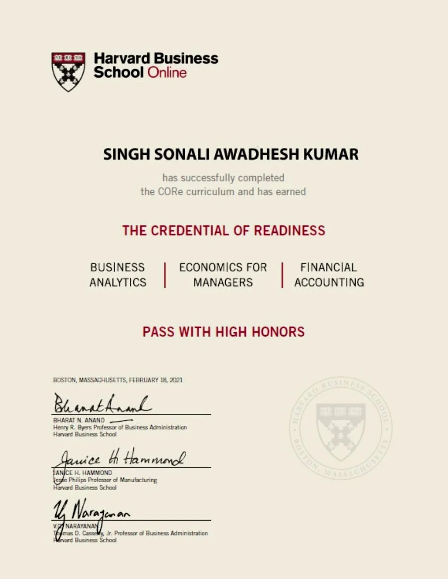 Completed HBS's prestigious Credential of Readiness, mastering fundamentals of asset management, economic strategy, and analytical thinking.